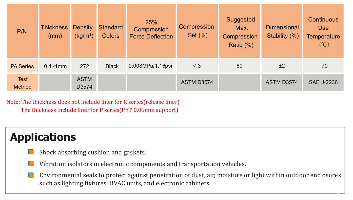 TM 丙烯酸泡棉 PA 系列特別柔軟,可提供超薄到中等厚度。PA系列具有良好的自粘合能力、低壓縮永久變形率、優異的沖擊吸收和抗振動性。" />