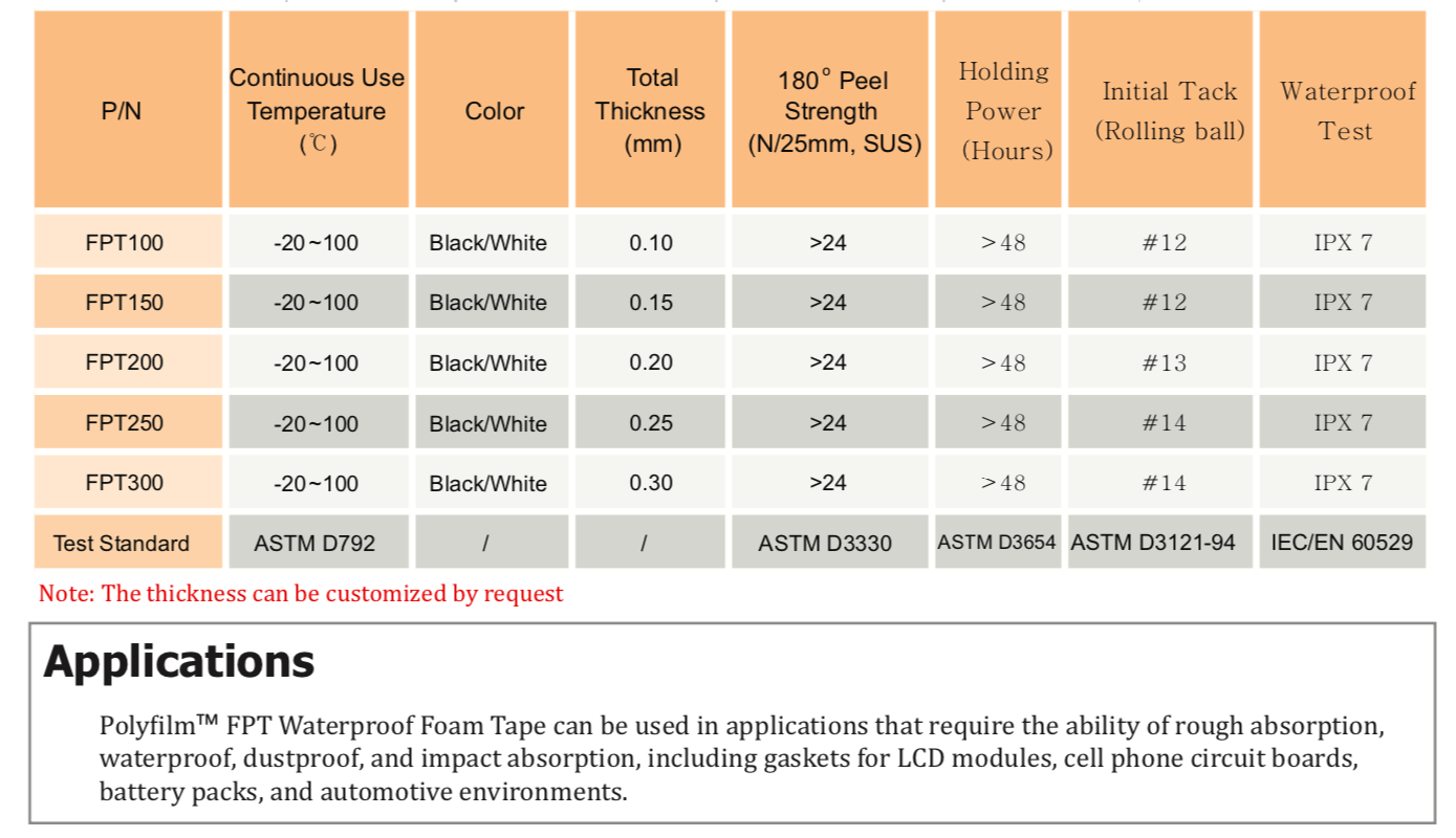 TM FPT 系列泡棉膠帶是一種雙面膠帶,由特定的聚乙烯泡棉和丙烯酸粘合劑組成。這種防水泡棉膠帶由于其微觀和獨立的細胞結(jié)構(gòu)而非常薄和柔軟。它具有高的沖擊吸收能力、出色的防水性能和回彈性。" />