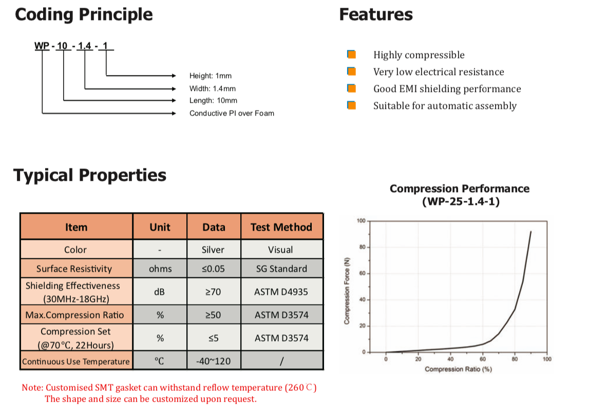 TMWP系列導(dǎo)電PI覆蓋泡棉材料由高導(dǎo)電Cu/Ni鍍層PI以及PU泡棉芯和導(dǎo)電壓敏丙烯酸粘合劑組成。這些材料具有極高的可壓縮性,專門設(shè)計用于提供卓越的EMI屏蔽和接地性能,并提供防塵和防潮保護(hù)。WP系列產(chǎn)品因其容易調(diào)整尺寸,適用于計算機(jī)、智能手機(jī)、LCD/TV和電信制造行業(yè)的固定墊圈應(yīng)用,可根據(jù)要求定制回流焊墊片。" />